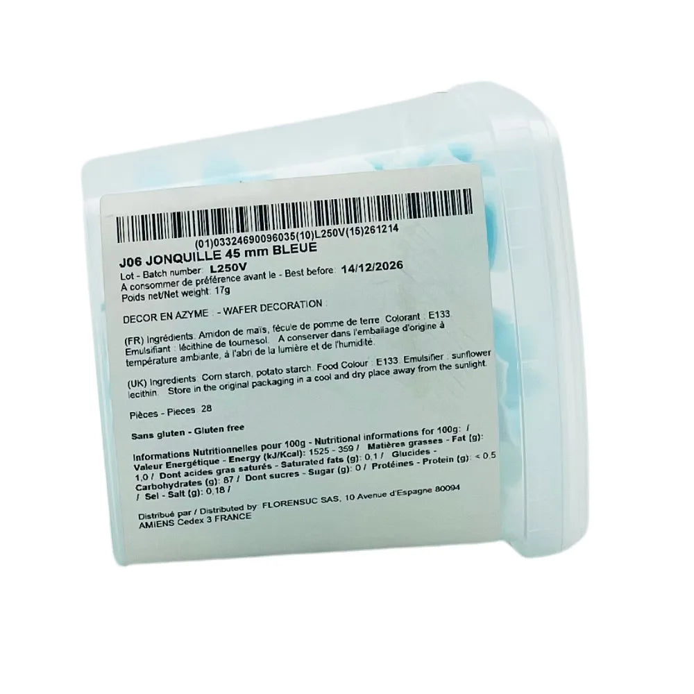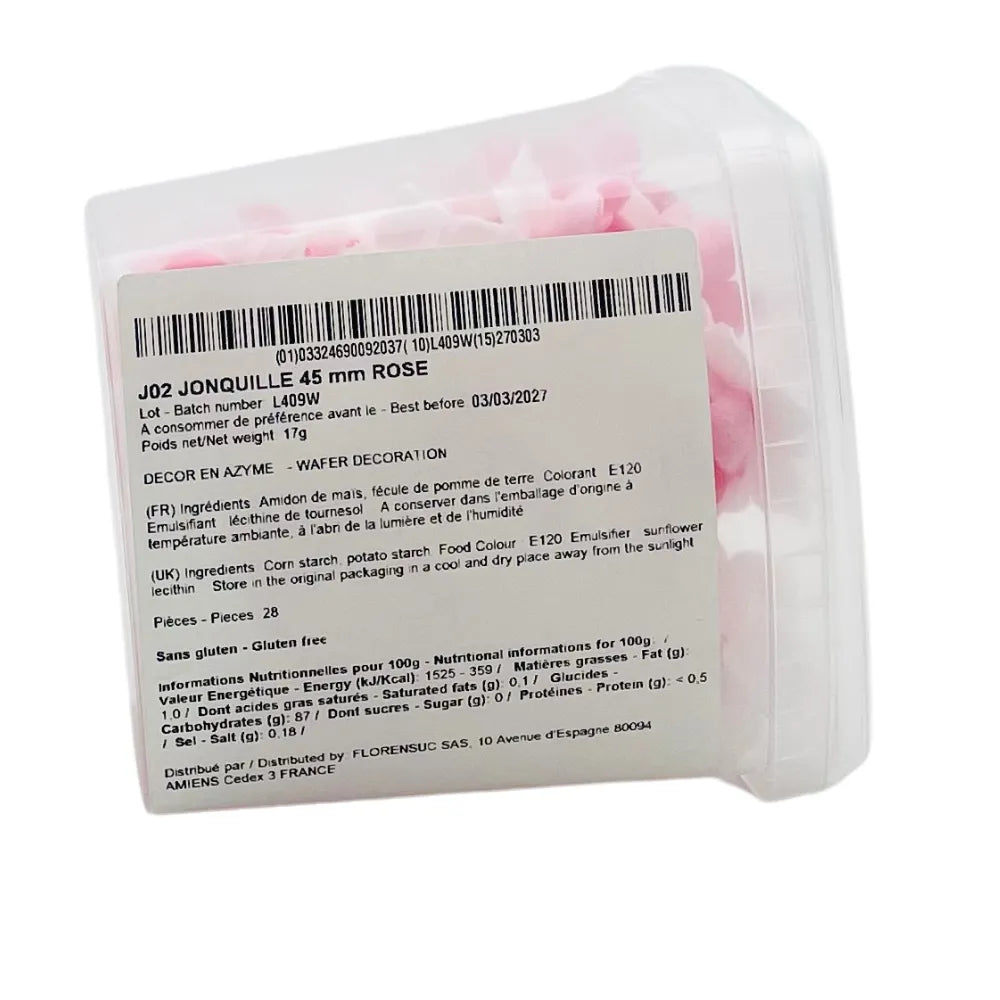 Un assortiment de 28 jonquilles azymes en trois couleurs vives : rose, jaune et bleu. Ces décorations comestibles ajoutent une touche élégante à tous vos desserts.