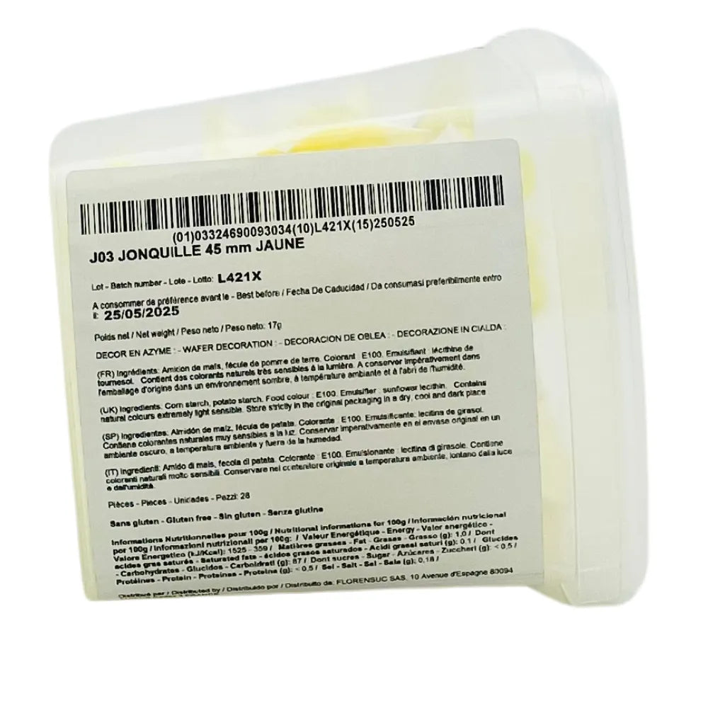 Ces jonquilles délicates de Florensuc sont parfaites pour embellir vos créations culinaires, des gâteaux d'anniversaire aux cupcakes festifs. Elles sont fabriquées sans gluten et avec des colorants naturels, garantissant non seulement beauté mais aussi sécurité alimentaire. Faciles à utiliser, elles se posent simplement sur le dessus de vos pâtisseries pour un effet décoratif instantané.