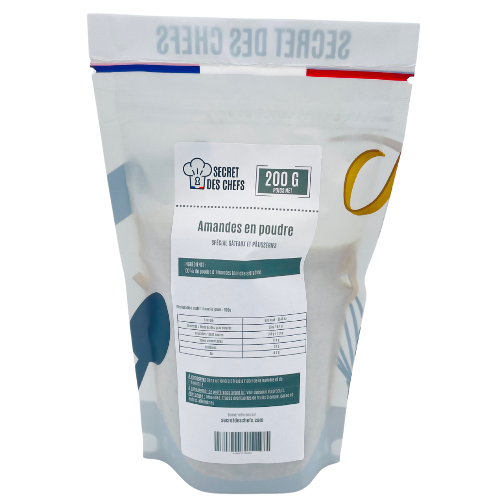 Cette poudre d’amande Secret des Chefs est l’ingrédient choisi pour réussir vos biscuits, financiers, frangipanes ou macarons. Fine, blanche et sans additif, elle garantit un moelleux incomparable et une texture parfaitement fondante.