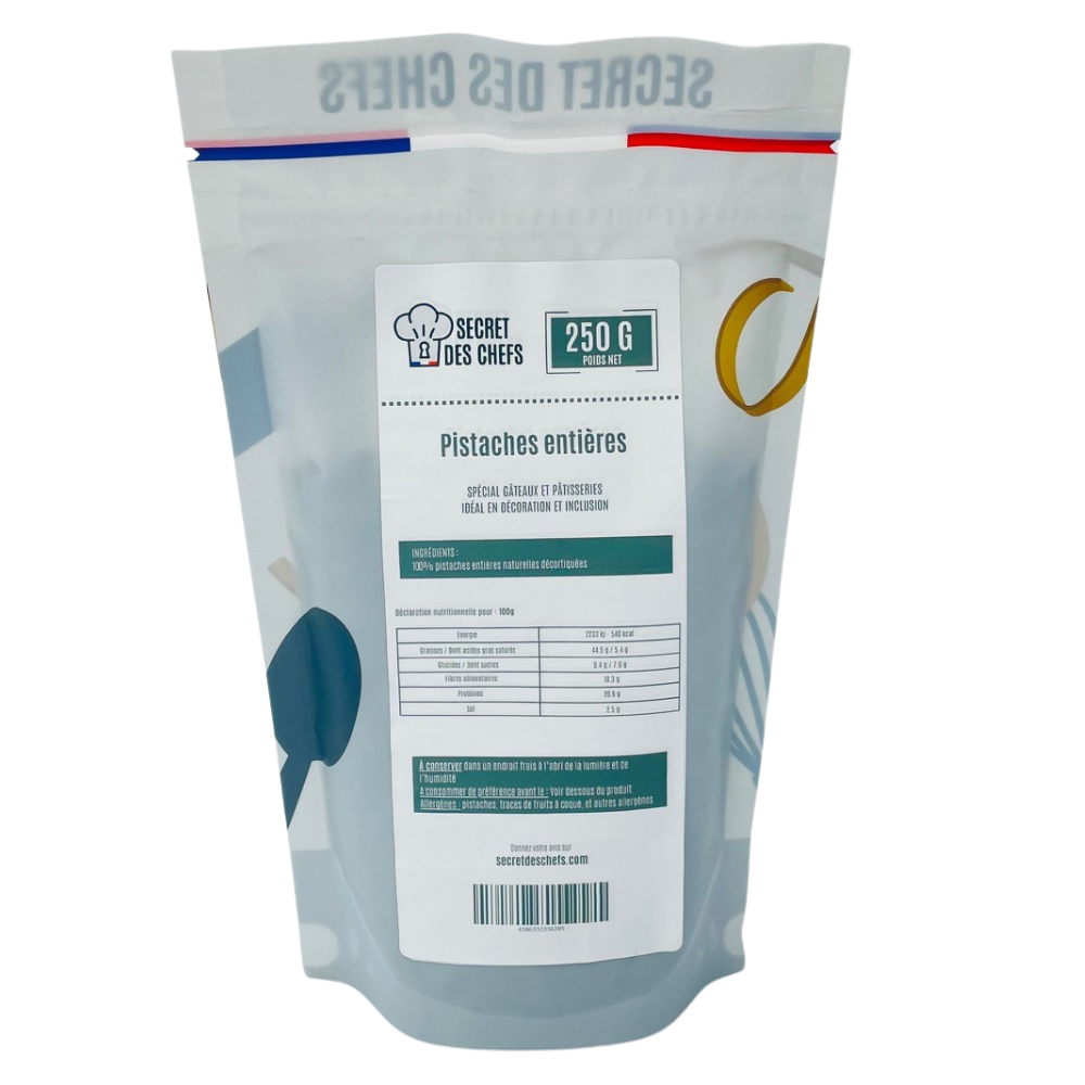 Spécialement pensées pour les besoins des pâtissiers, ces pistaches entières de 250 g vous garantissent un résultat aussi beau que savoureux. Leur calibre régulier évite les surprises en déco ou en inclusion, tandis que leur goût franc donne du caractère à toutes vos préparations : pâte de pistache maison, entremets, biscuits ou garnitures. Contrairement aux produits de moindre qualité, elles conservent leur couleur même après cuisson et ne deviennent pas molles ou ternes. Le sachet refermable permet de garder intactes leur fraîcheur et leur intensité aromatique.