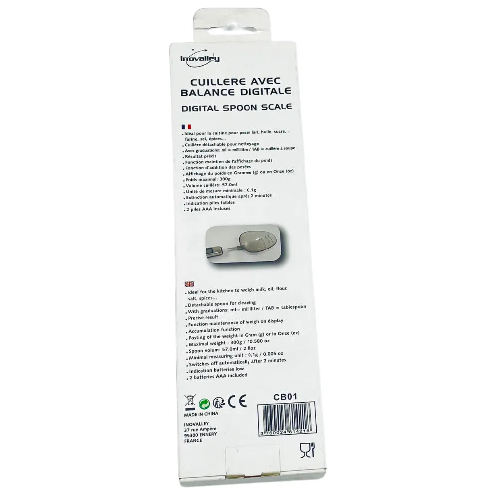 La cuillère avec balance digitale de la marque Inovally est un outil indispensable pour toute cuisine. Elle permet de mesurer avec précision les ingrédients secs et liquides jusqu'à 300 grammes, grâce à son unité de mesure minimale de 0,1 gramme. Idéale pour peser le lait, l'huile, la farine, le sucre, le sel et les épices, cette cuillère est également équipée d'un écran d'affichage pratique. La cuillère est détachable pour un nettoyage facile et s'éteint automatiquement après 2 minutes d'inactivité pour économiser les piles. Les piles nécessaires sont incluses.