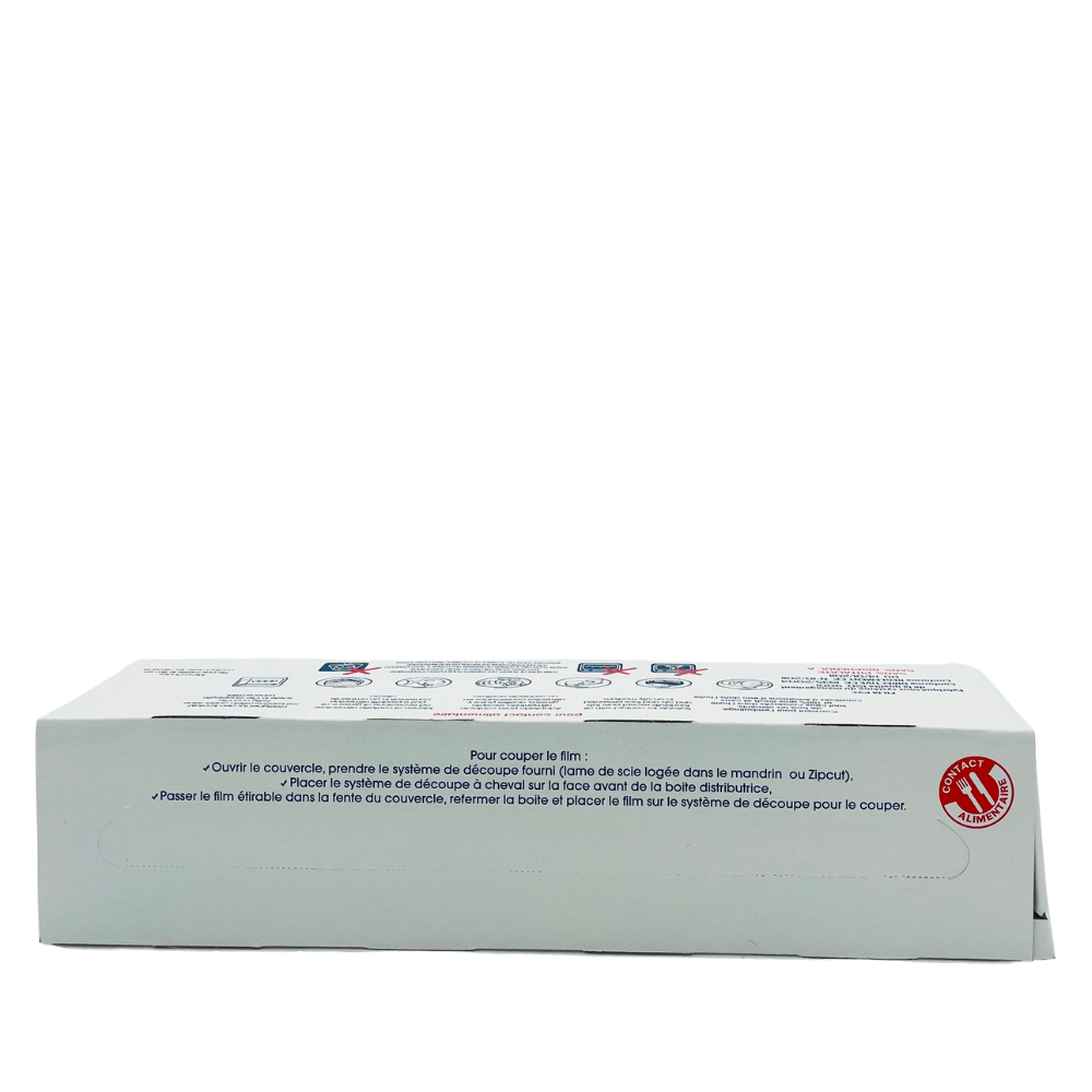 Étirabilité et adhérence élevées, boîte distributrice avec coupe-film intégré, et longueur garantie pour un usage longue durée.