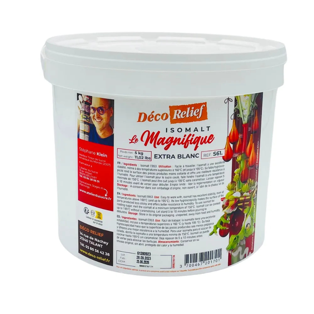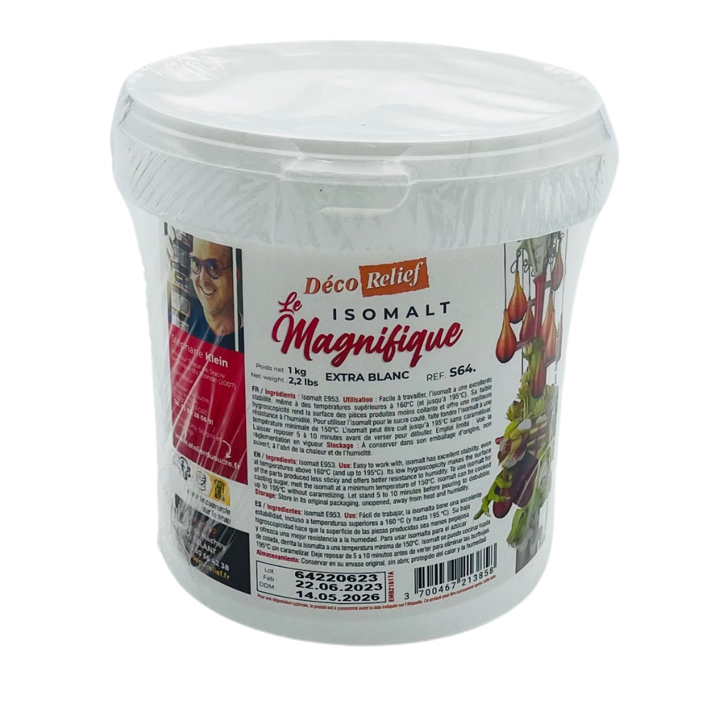 L'Isomalt "Le Magnifique" de Déco Relief est un choix préféré des chefs pâtissiers pour la création de pièces artistiques en sucre. Ce produit extra blanc assure une finition transparente et brillante, idéale pour des pièces de décoration spectaculaires. Il est facile à manipuler, fond à des températures contrôlées et ne devient pas collant ou opaque avec l'humidité, garantissant ainsi des créations esthétiques et durables.