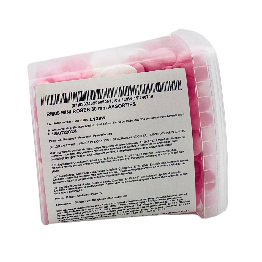 Un assortiment de 72 mini roses azymes en plusieurs couleurs vives, parfaites pour décorer avec élégance vos desserts et pâtisseries.