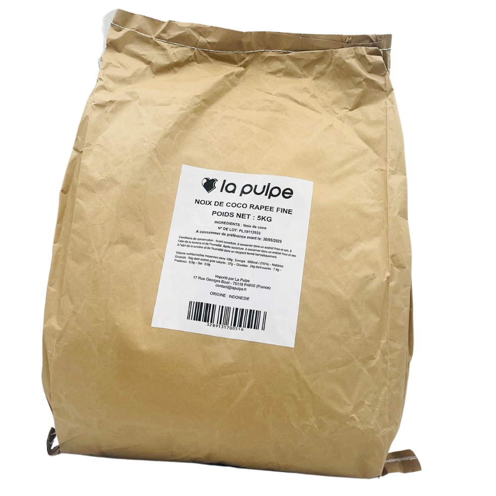 La noix de coco râpée fine "Pulpe" est votre alliée pour des créations pâtissières et culinaires exotiques. D'une texture légère et aérienne, elle est idéale pour ajouter une touche de fraîcheur à vos recettes.
