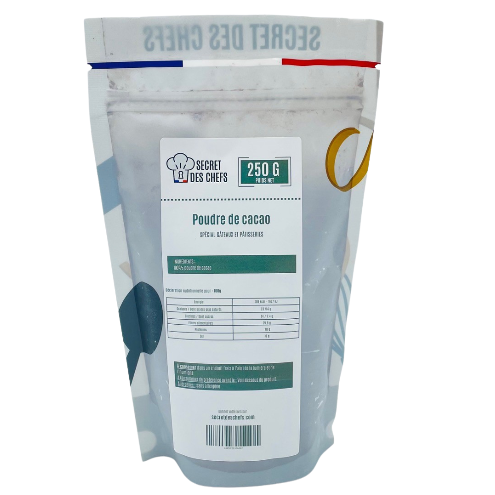 Poudre de cacao 100% pure, idéale pour toutes vos préparations sucrées comme les gâteaux, mousses et boissons chocolatées. Sans sucre ajouté, naturelle et savoureuse.