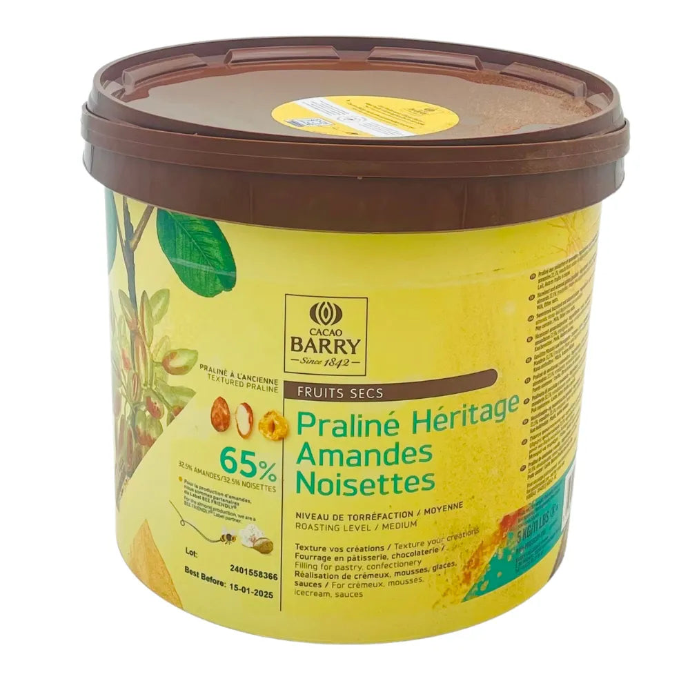 Le Praliné Héritage de Cacao Barry est un mélange exquis de 32,5% d'amandes et 32,5% de noisettes, torréfié à un niveau moyen pour développer une saveur riche et équilibrée. Ce praliné est parfait pour être utilisé comme fourrage dans les pâtisseries, chocolateries, et crèmes glacées. Sa texture onctueuse et son goût intense en font un ingrédient incontournable pour les professionnels et les amateurs de pâtisserie. Conditionné en seau de 5 kg, il est idéal pour une utilisation régulière ou intensive.