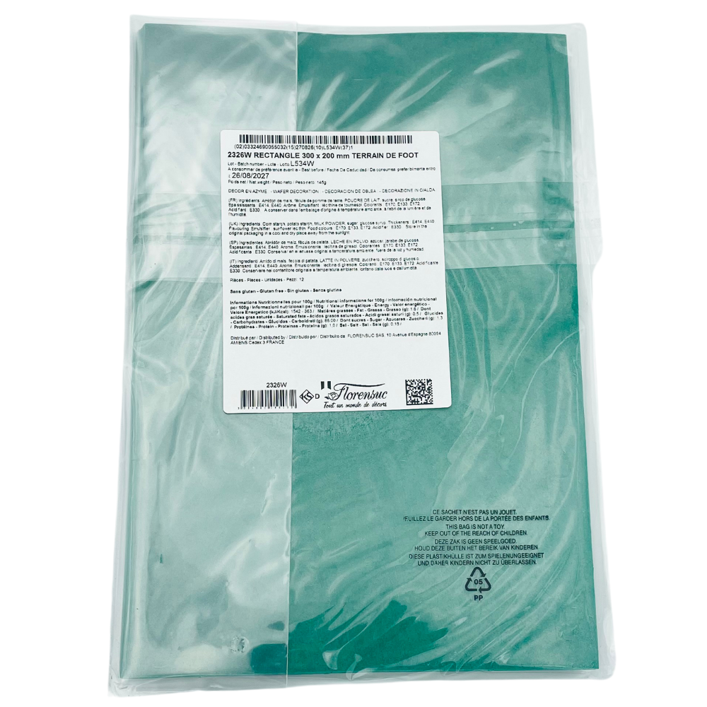 Ce terrain de foot en azyme de couleur verte est parfait pour ajouter une touche sportive à vos créations pâtissières. Chaque pièce mesure 300 x 200 mm, offrant une grande surface pour décorer gâteaux, cupcakes, et autres desserts. Le lot comprend 12 pièces, ce qui permet de décorer plusieurs pâtisseries pour vos événements à thème football. Produit fabriqué par Florensuc, reconnu pour la qualité de ses décorations comestibles.